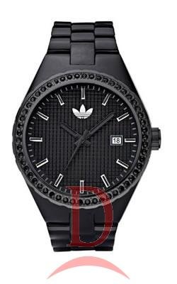 Striking black Adidas women's watch from the Cambridge collection. This sporty watch has a black checked dial with luminous hands and index markers, and a date aperture at the 3 o'clock marker- all set within a stone-set bezel. This watch is secured with a black plastic strap with pin and buckle fastening and is water resistant to 50 meters (165 feet) 5ATM.